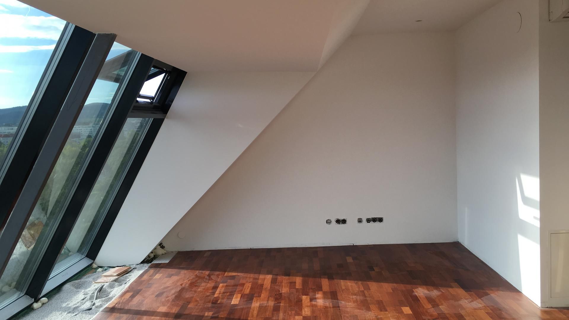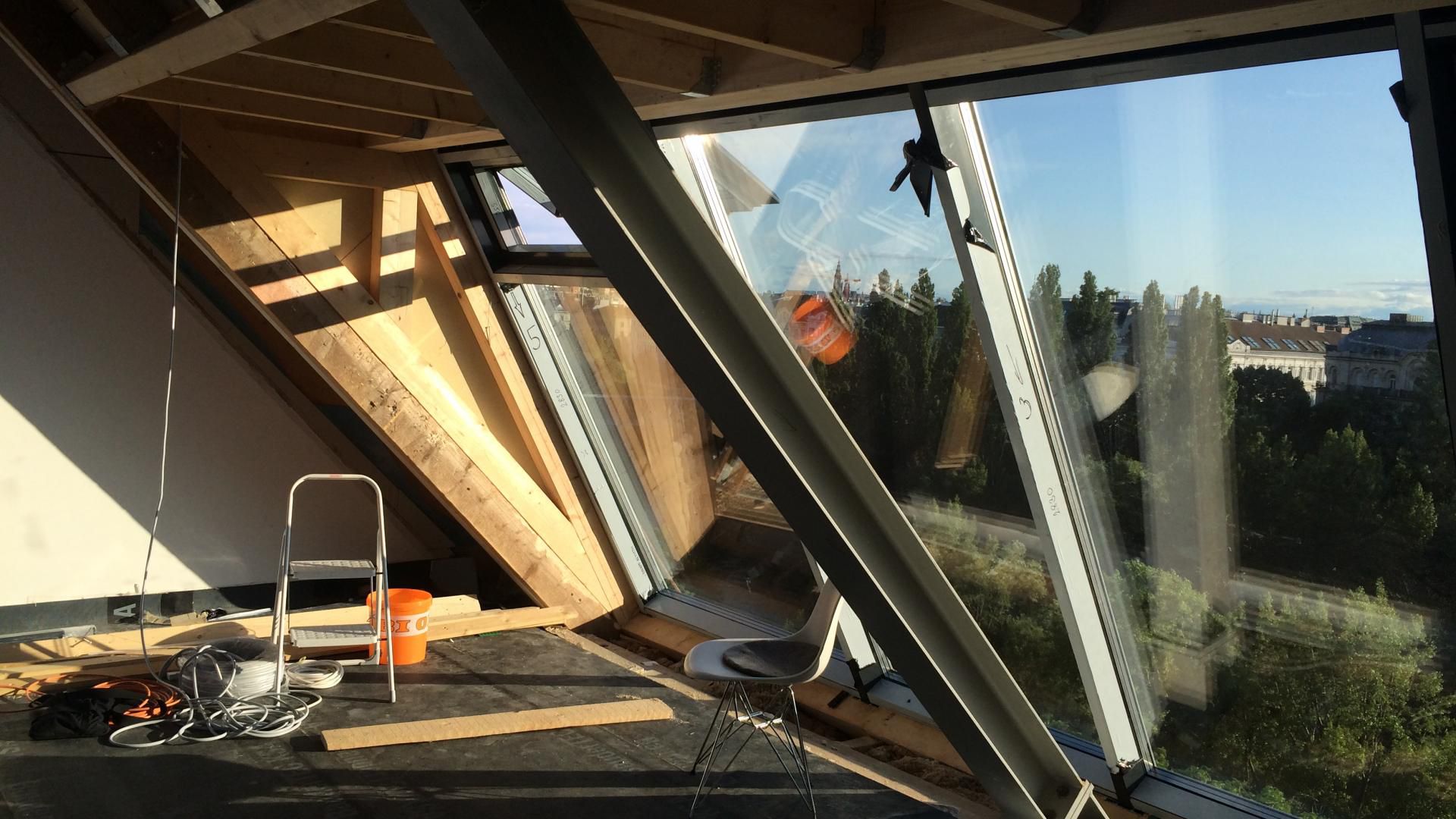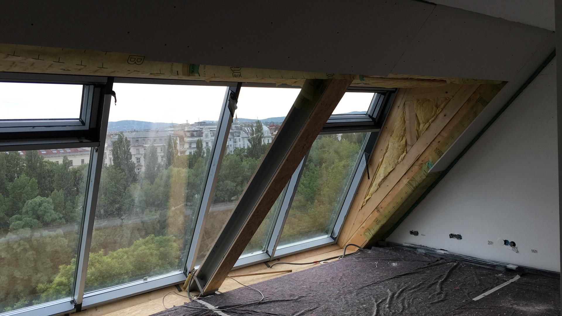Im Projekt „Perinetgasse“ nahm BAUDRAUF eine umfassende Dachstuhlsanierung vor. Kernziel: Umbau und Dämmung des Dachstuhls, kombiniert mit Trockenbau-Verkleidung und einer großzügigen Glasfront, um aus dem Wohnbereich einen Aussichtspunkt mit beeindruckendem Blick über den Donaukanal und Wien zu schaffen. Die Dachsanierung zielt auf Technik, Komfort und Erlebnis gleichermaßen ab.