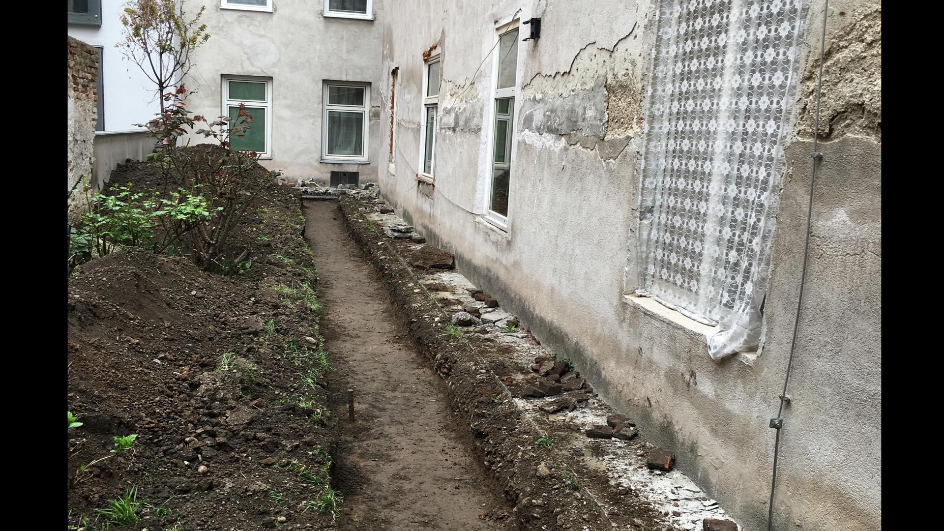 - Seitlicher Erdaushub, um unterhalb der Bodenplatte ein horizontales Schnittverfahren zur Abdichtung durchzuführen.