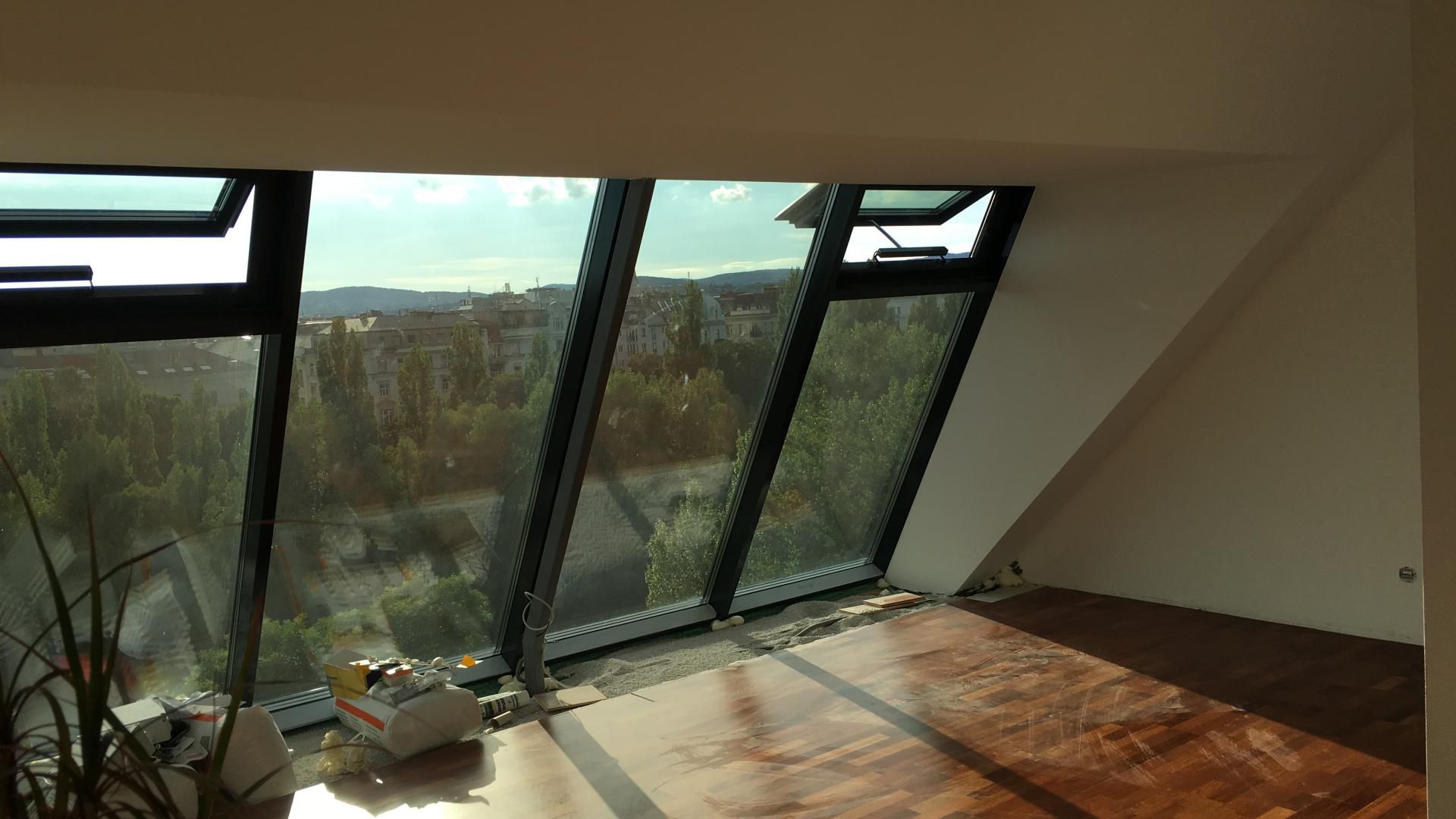 - Integration einer großen Glasfront, die den Wohnraum optisch öffnet und einen atemberaubenden Ausblick über Wien ermöglicht – panoramareif, stilvoll und technisch sauber umgesetzt.