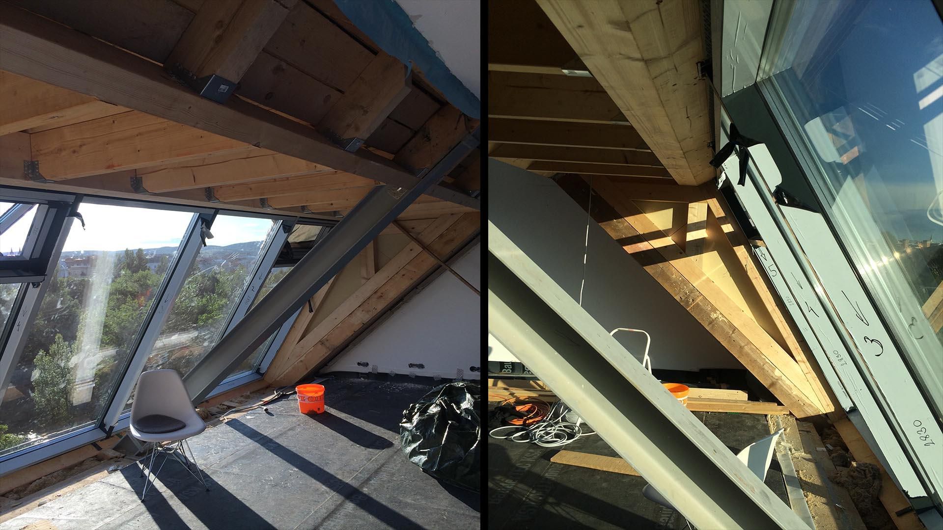 Im Projekt „Perinetgasse“ nahm BAUDRAUF eine umfassende Dachstuhlsanierung vor. Kernziel: Umbau und Dämmung des Dachstuhls, kombiniert mit Trockenbau-Verkleidung und einer großzügigen Glasfront, um aus dem Wohnbereich einen Aussichtspunkt mit beeindruckendem Blick über den Donaukanal und Wien zu schaffen. Die Dachsanierung zielt auf Technik, Komfort und Erlebnis gleichermaßen ab.